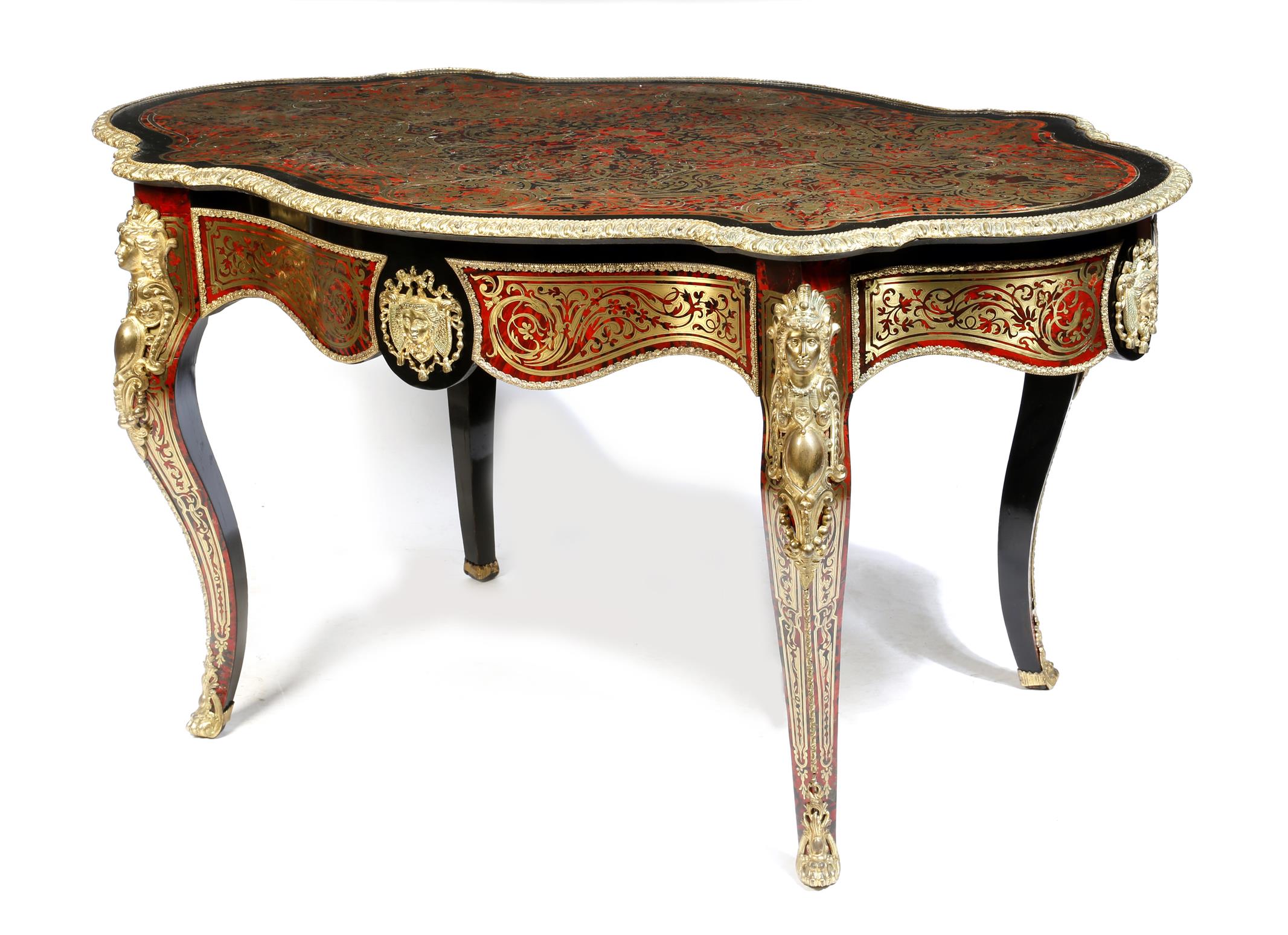 λ A 19th century French boulle marquetry centre table, with ormolu mounts, the serpentine top with cut brass inlay on a tortoiseshell ground, with strapwork, leaves, scrolls and winged cherubs, above a frieze drawer and on cabriole legs with female bust masks, 77cm high, 147.8cm wide, 88.5cm deep.
