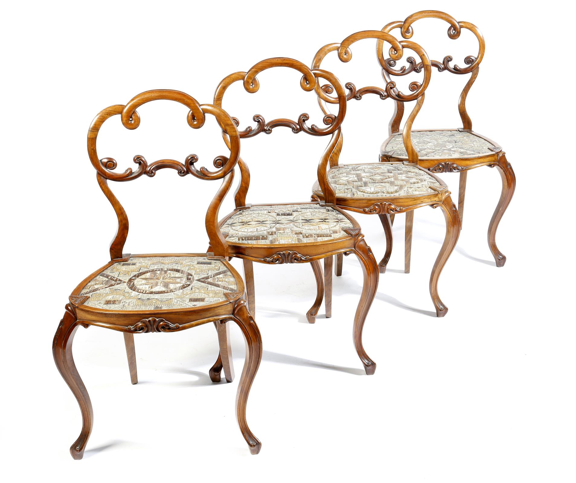 Four 19th century Anglo-American walnut side chairs, each with a scroll decorated back above a native American Micmac porcupine quill seat, with geometric decoration, on moulded cabriole legs. (4)