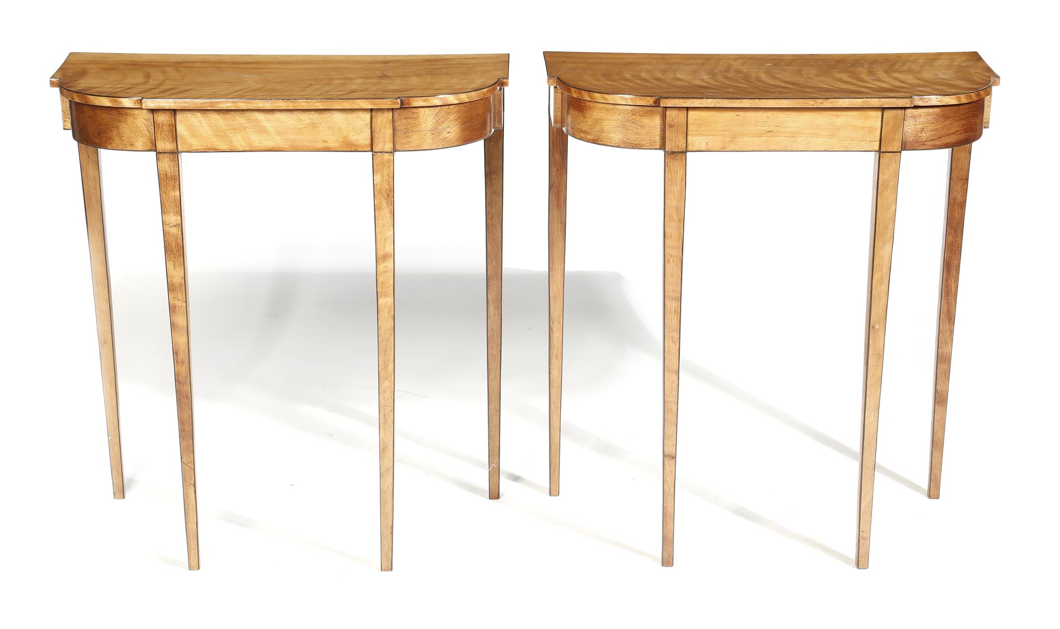 A pair of satin veneered console tables in George III style, inlaid with ebonised stringing, each with a breakfront top, on tapering legs, probably late 19th / early 20th century, 82 cm high, 74.4cm wide, 34.2cm deep. (2)