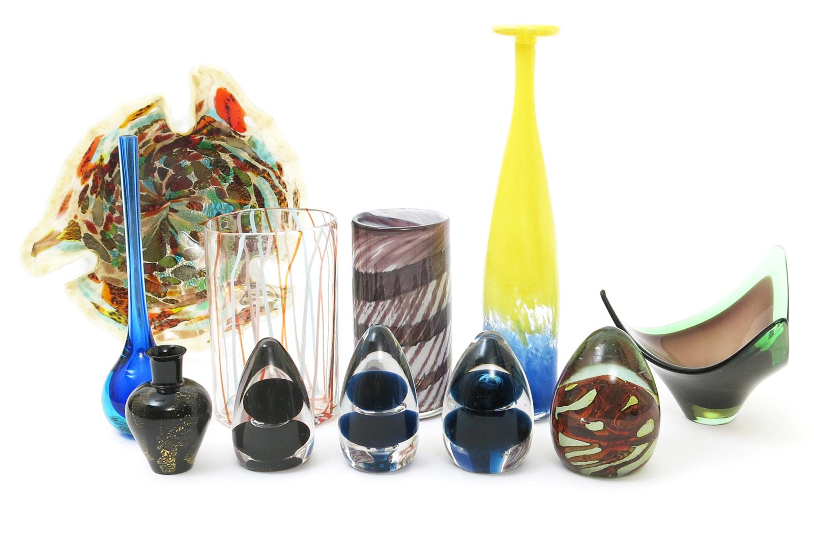 Three glass paperweights designed by Ronald Stennett-Willson, blue blown glass cased in clear, another paperweight probably M'dina, five vases and a collection of glass, unsigned, 10cm. high, (30)