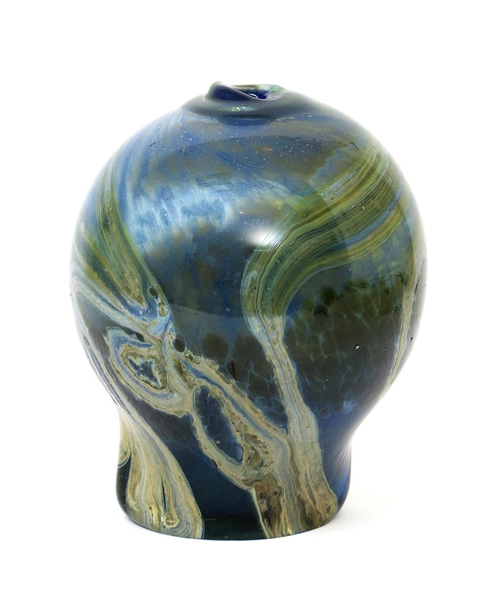 a glass Head vase made at the Jam Factory, South Australia, dated 1978, swollen form with small aperture, streaked green and blue glass with metallic oxide swirl decoration, etched signature, SH1853 and date, original paper label, 31cm. high