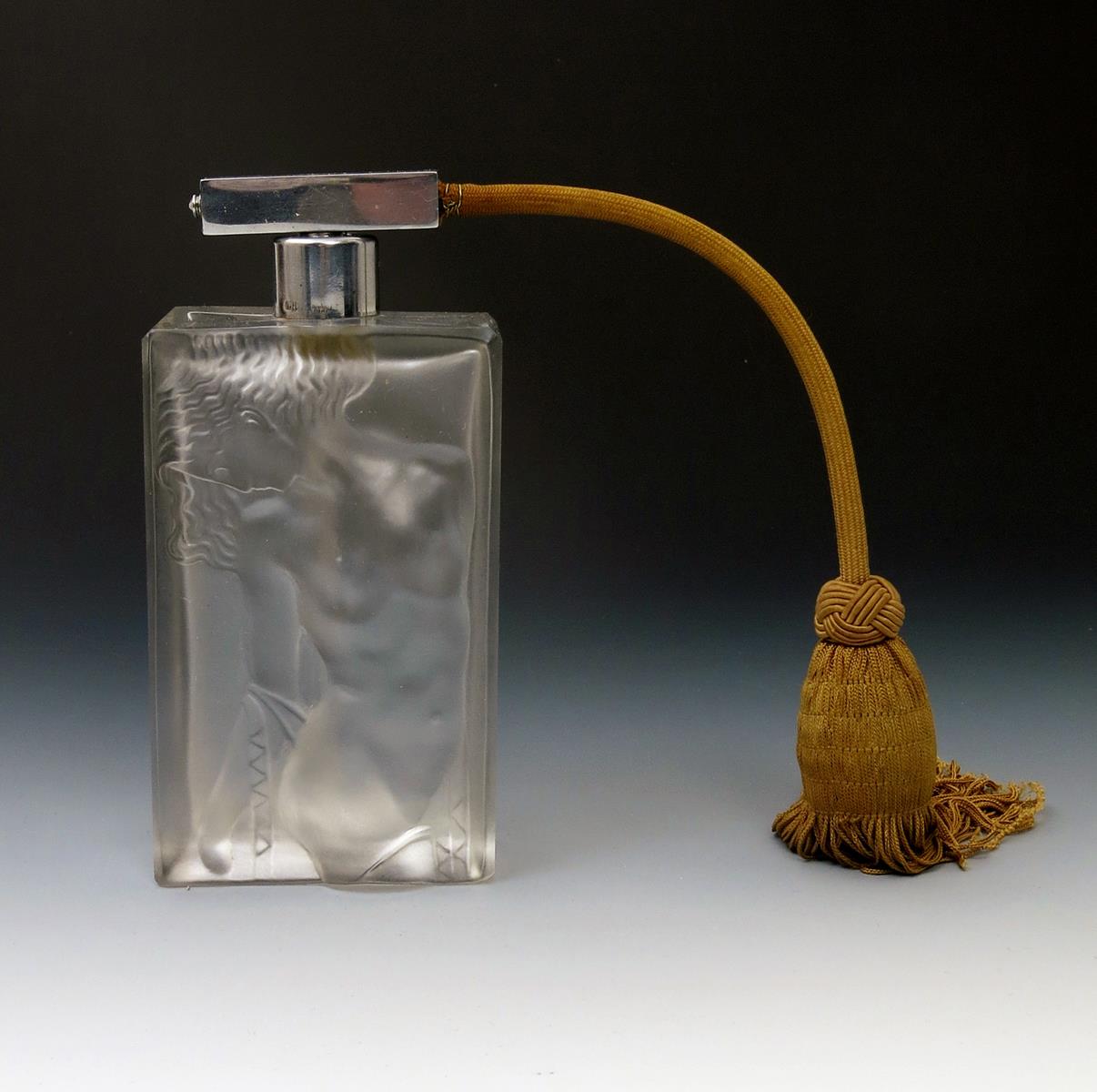 A clear and frosted glass atomiser the design attributed to Michael Powolny, rectangular form, cast in relief with a naked female, with chrome atomiser, stamped mark to mount, 16.5cm. high