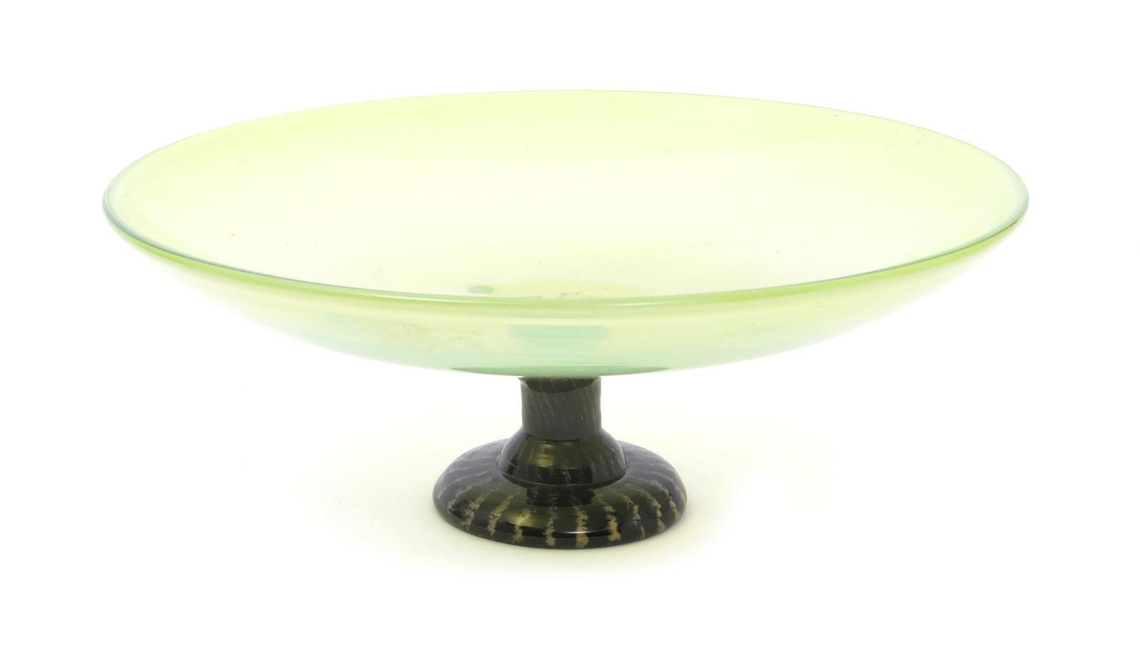 A Charles Schneider glass tazza, lime green glass shallow bowl on applied black glass foot with internal striations, unsigned 34cm. diam.