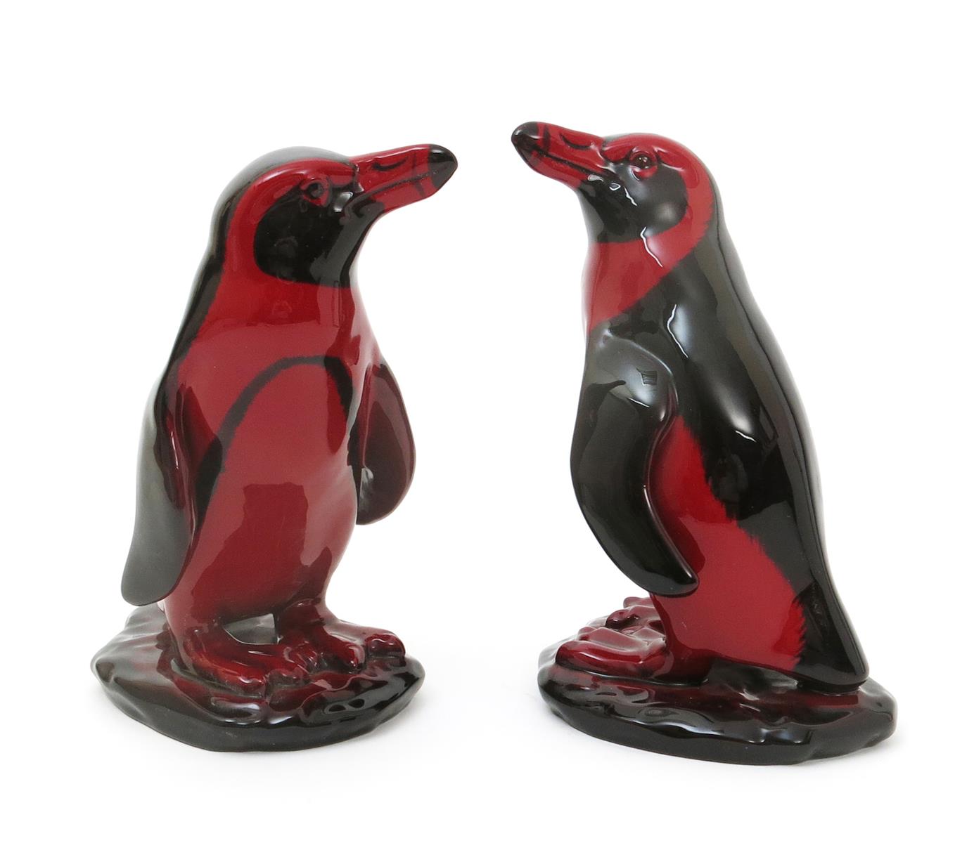 Peruvian Penguin HN.946 two Royal Doulton flambe animals designed by Charles Noke, covered in a red flambe glaze, printed factory marks, 22.5cm. high (2)