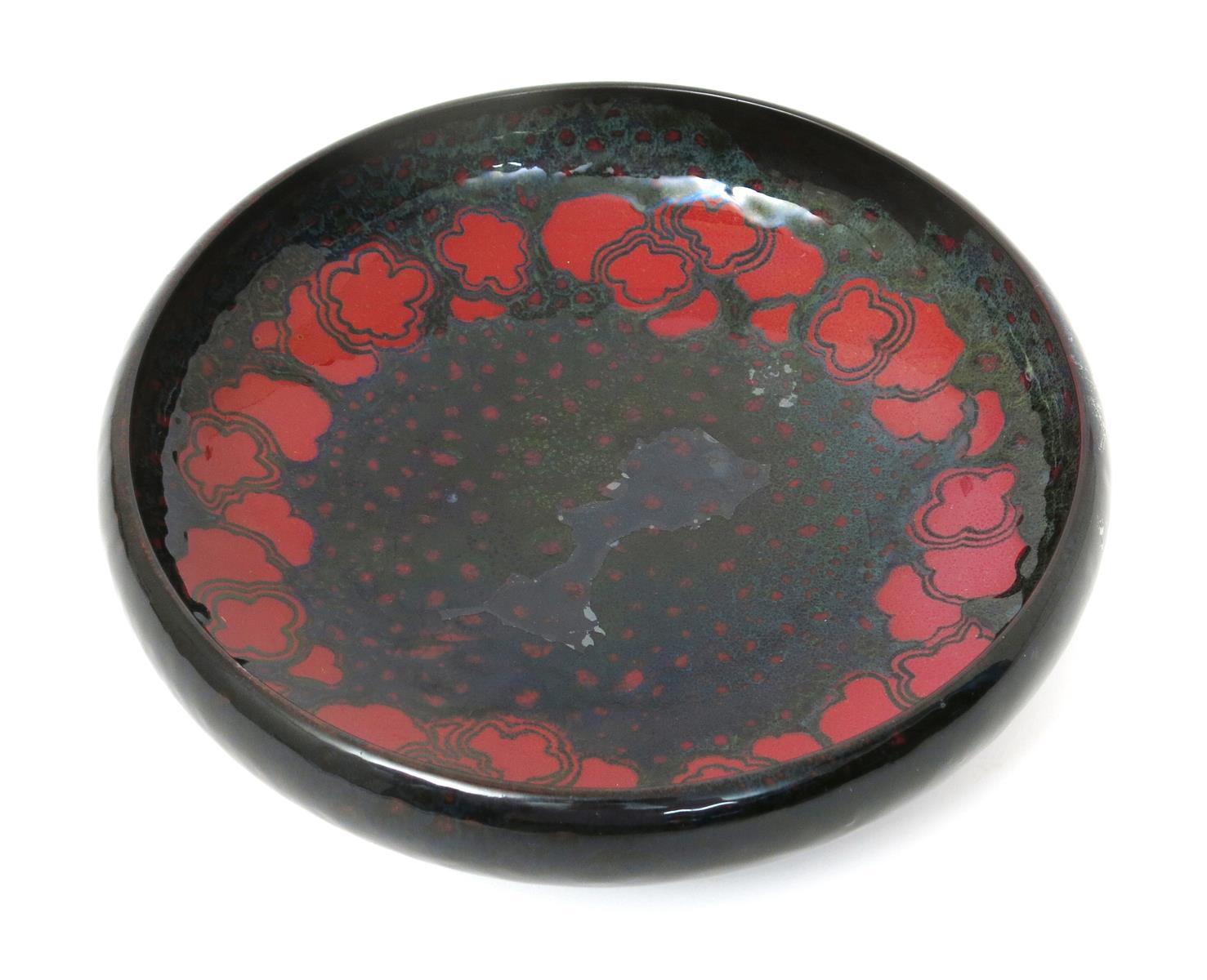 A Royal Doulton Sung pottery floating bowl designed by Charles Noke, internally decorated with a simple cloud motif in red flambe on speckled dark blue and green ground, the exterior running and mottled dark blue printed factory mark, professional spray to interior, 28cm. diam.