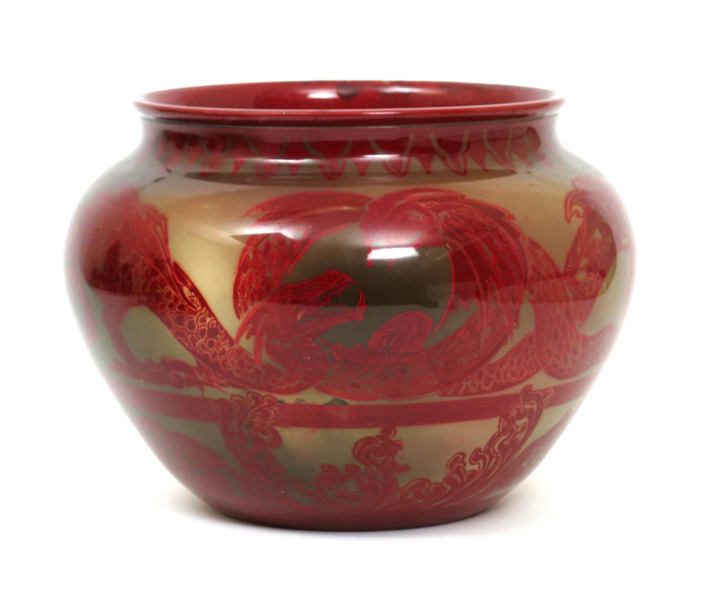 A large Bernard Moore flambe jardiniere, shouldered, ovoid form, painted with two ferocious dragons, above scrolling foliage, in ruby flambe on a mushroom brown ground, internally decorated with scrolling foliage band, painted Bernard Moore mark and HL artist monogram, 26.5cm. high