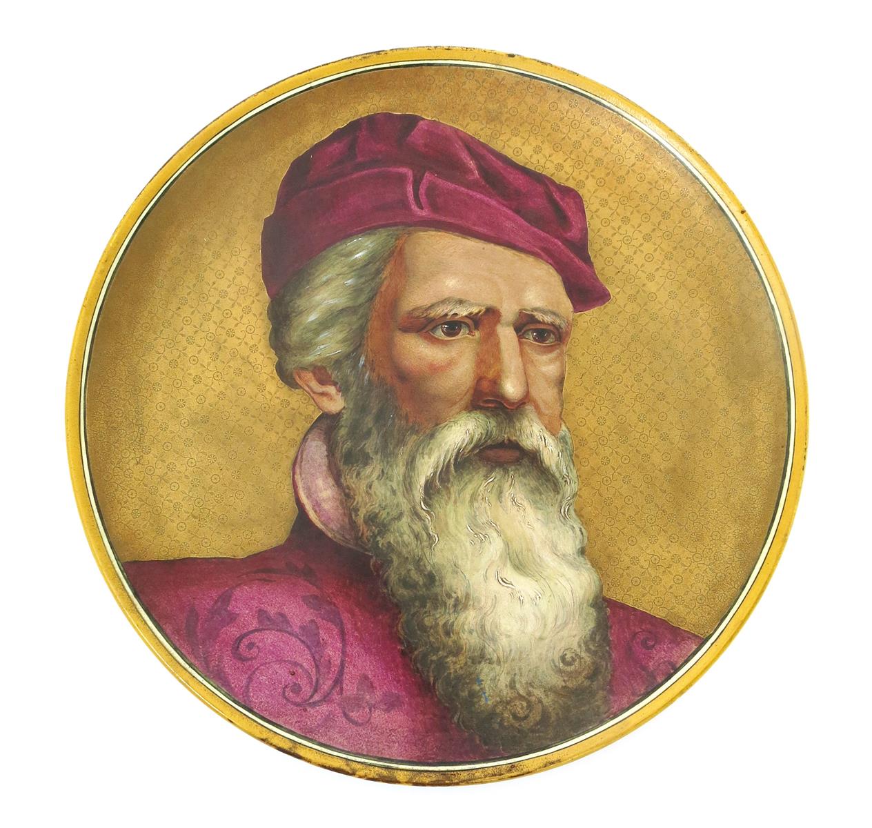 A large Pinder Bourne & Co charger probably retailed by Howell & James, painted with a medieval gentleman in puce robe and hat, on patterned gilt ground, impressed mark, painted JC monogram and original paper label, 44cm. diam.
