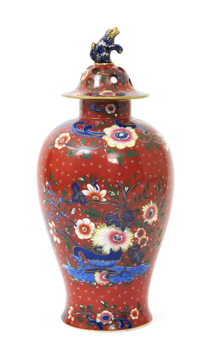 An H & R Daniels stoneware Japan vase pot pourri vase and cover, with inner cover, slender baluster form painted with flowers and foliage in colours on an iron red ground, the pierced cover with dog of fo finial, highlighted in gilt, printed factory mark, professionally restored, 43cm. high