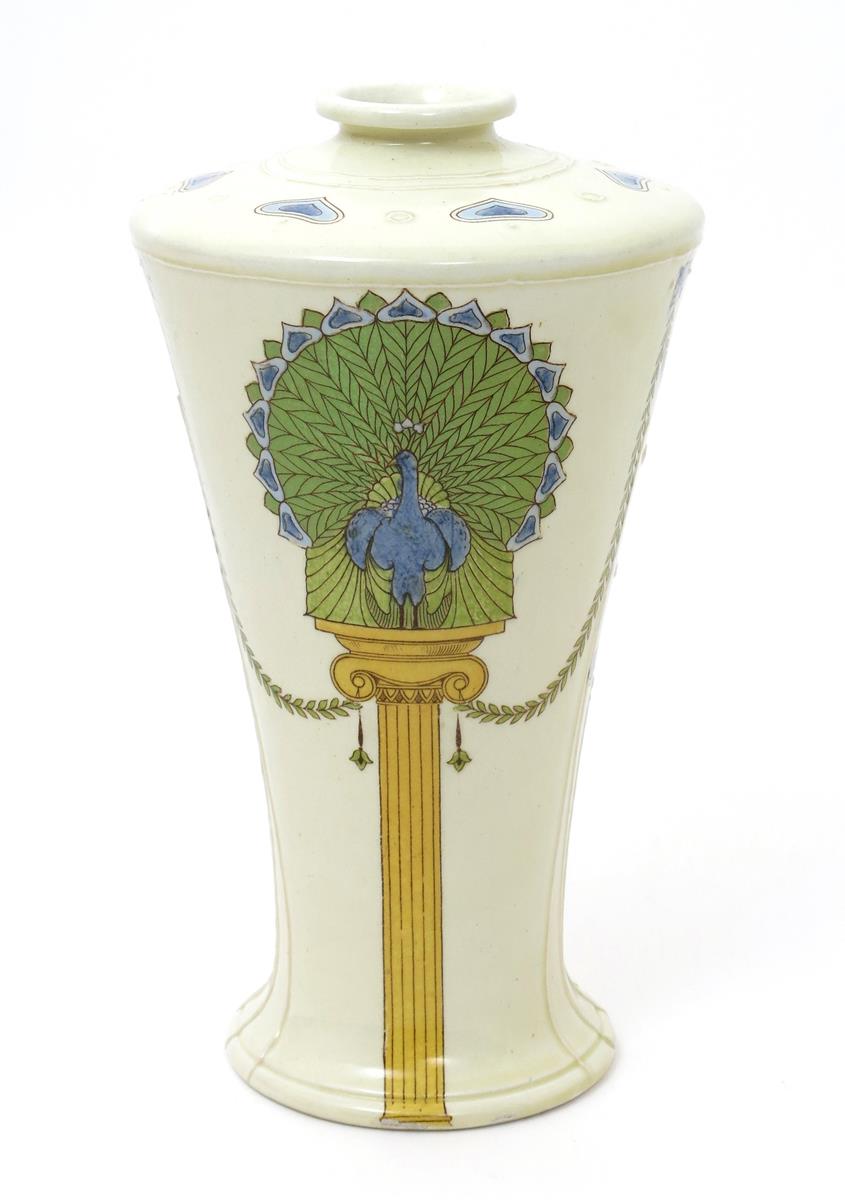 A Minton's Pottery vase, model no.3708, shouldered form, printed with a peacock standing on an Ionic pillar, in colours with slip applied work, impressed marks, 29.5cm. high