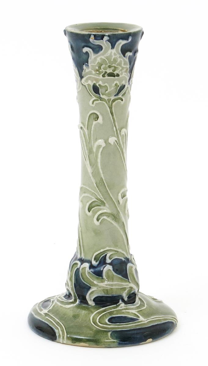 'Poppy' A James Macintyre candlestick designed by William Moorcroft, tubeline decorated with Art Nouveau poppy stems in blue and green incised signature, glaze chip to top rim, 15.5cm. high