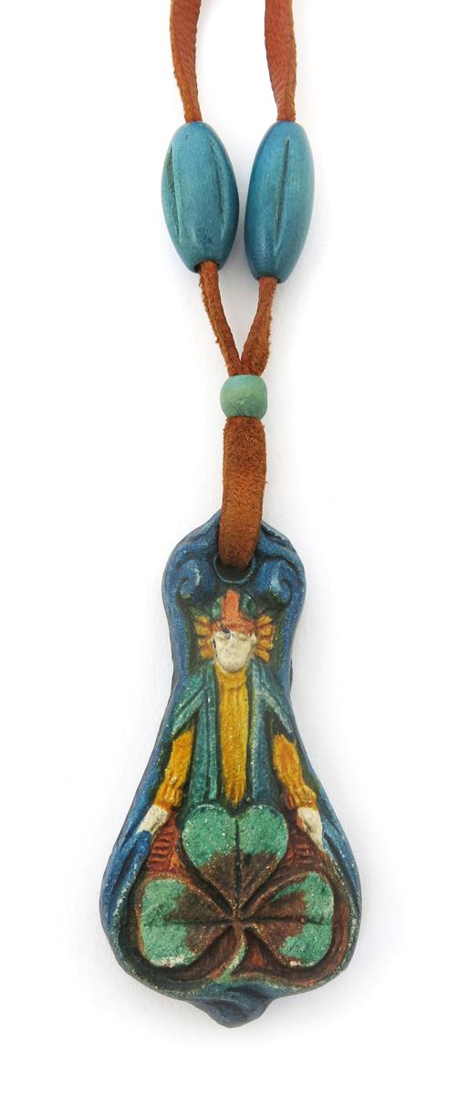 A Compton Pottery pendant, cast in low relief with St Patrick and a shamrock leaf, in colours, on leather chord with beads unsigned, 5.5cm. long