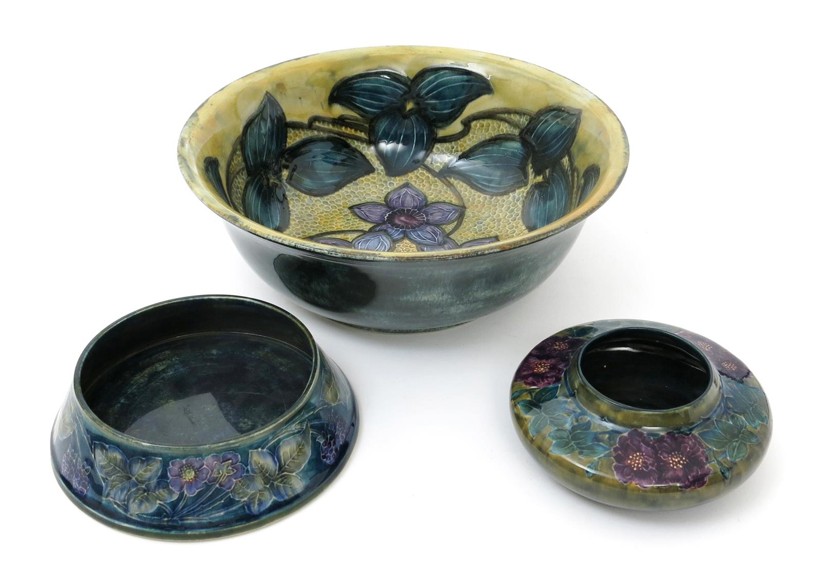 A Hancock & Son Morrisware vase by George Cartlidge, pattern no.C5-11, compressed form, tubeline decorated with flowers and foliage in purple and blue on a mottled green ground, a Morrisware bowl C46-5 and a bowl C75-2, printed factory mark, painted facsimile signature, daffodil bowl restored, 13cm. diam. (3)