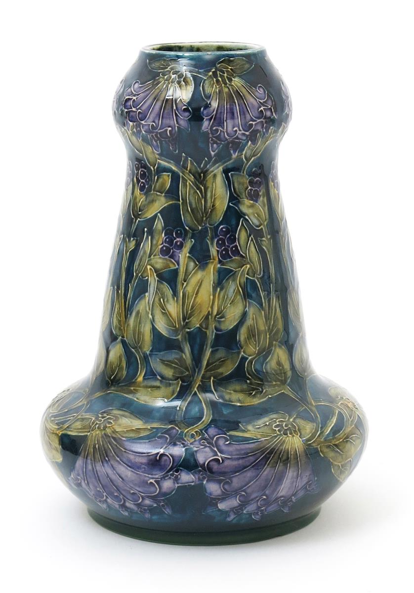 A Hancock & Sons Morrisware vase designed by George Cartlidge, model no.C18-11, tapering form with knopped neck, slip decorated with bell flowers in purple and green on a mottled blue ground, printed factory mark, painted facsimile signature, professional restoration to base rim, 24.5cm. high