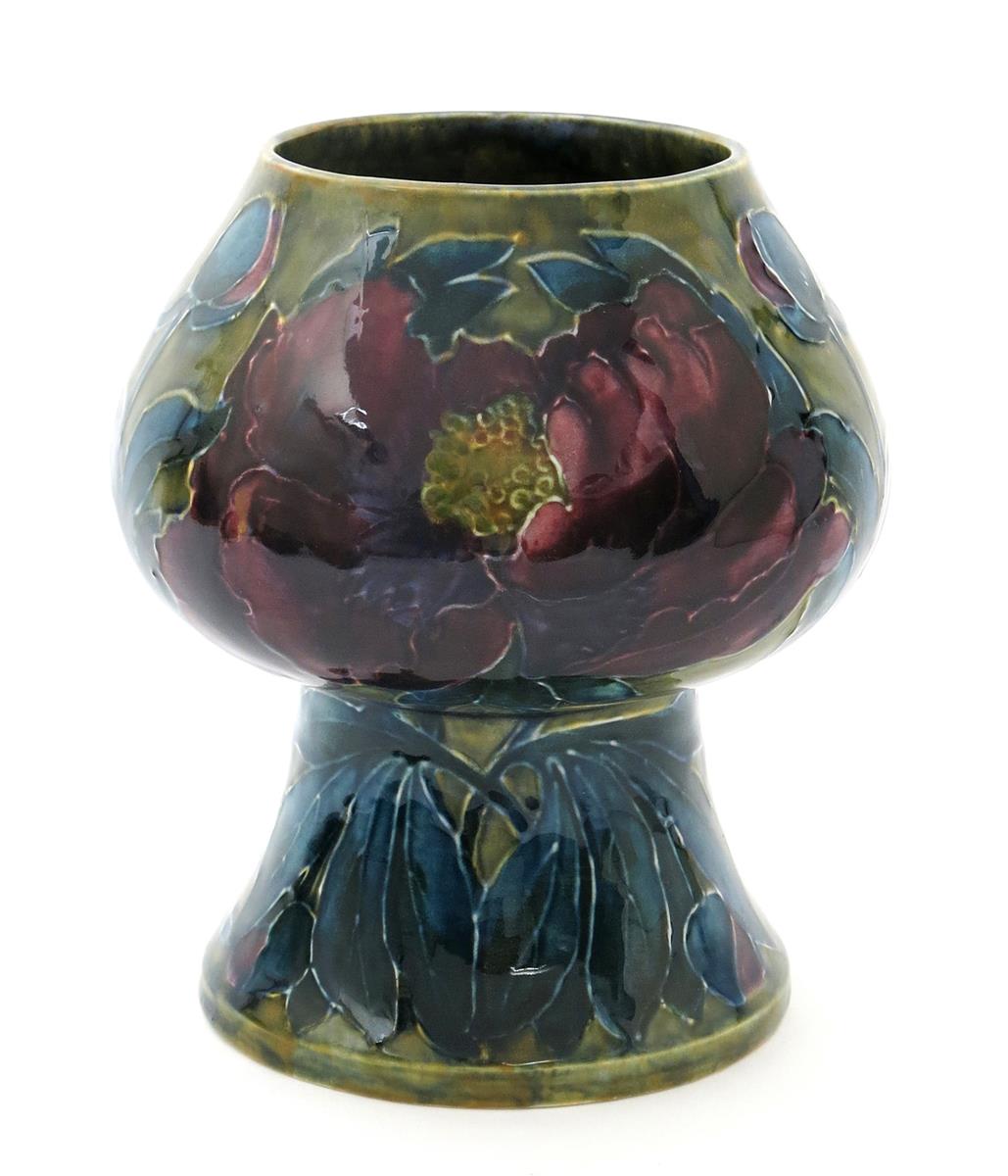 A Hancock & Sons Morrisware vase designed by George Cartlidge, model no. C8-4, tubeline decorated with peony flowers in purple, yellow and green-blue on a mottled green ground, printed factory mark, painted facsimile signature, professional restoration to top rim, 16.5cm. high