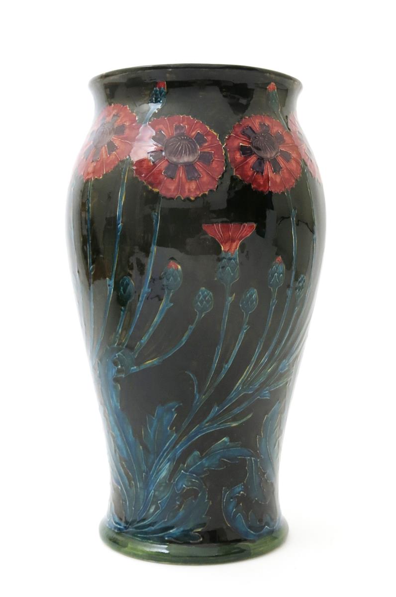 A Hancock & Sons Morrisware vase designed by George Cartlidge, model no. C14-3, swollen form with everted rim, tubeline decorated with cornflowers in red and green on a mottled brown ground printed factory mark, painted facsimile signature, 33cm. high