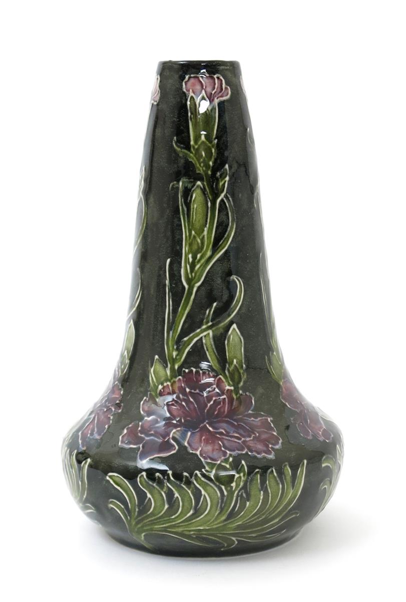 A Hancock & Son Morrisware vase designed by George Cartlidge, pattern no. C10-5, compressed form with tapering neck, painted with flower stems in purple and green on a black ground, printed factory mark, painted facsimile signature, 22.5cm. high.