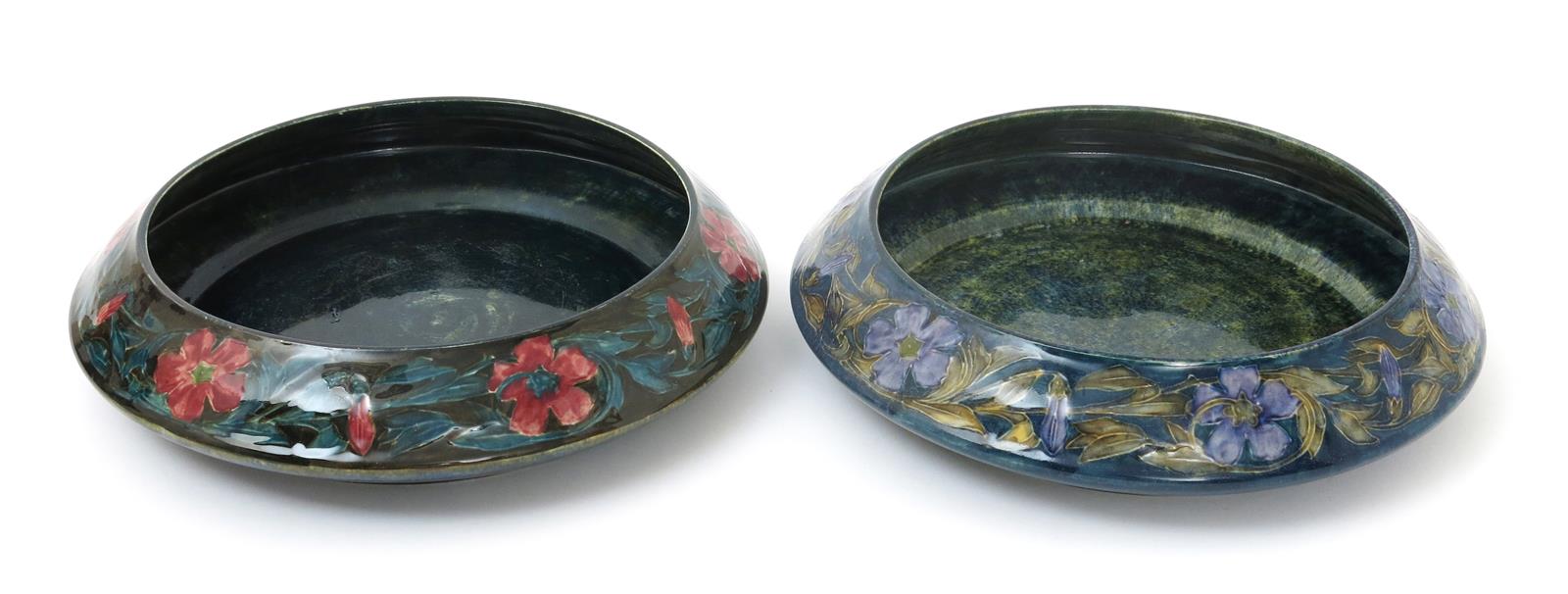 A Hancock & Sons Morrisware floating bowl designed by George Cartlidge, model no. C19-13, painted to the rim with a frieze of flowers in purple and green on a mottled blue ground, and another pattern no.C19-15, printed factory mark, painted facsimile signature, professional restoration to 2nd bowl, 29cm. diam. (2)