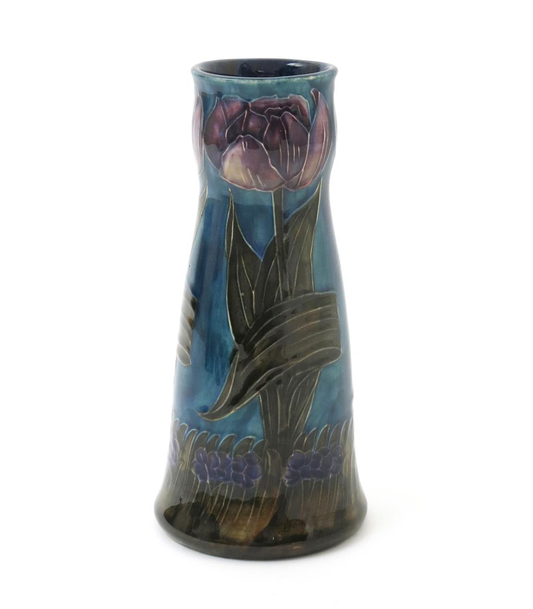 A Hancock & Son Morrisware vase designed by George Cartlidge, pattern no. C7-11, tapering cylindrical form with everted rim, tubeline decorated with tulip flowers, in purple and green on a blue ground, printed factory mark, painted facsimile signature, 20cm. high