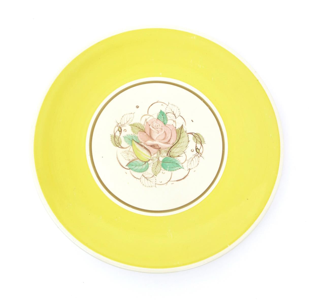 'Patricia Rose' a Susie Cooper Production wall charger, model no.1895, decorated to the well in colours, inside a vivid yellow border, printed and painted factory marks, 37cm. diam.