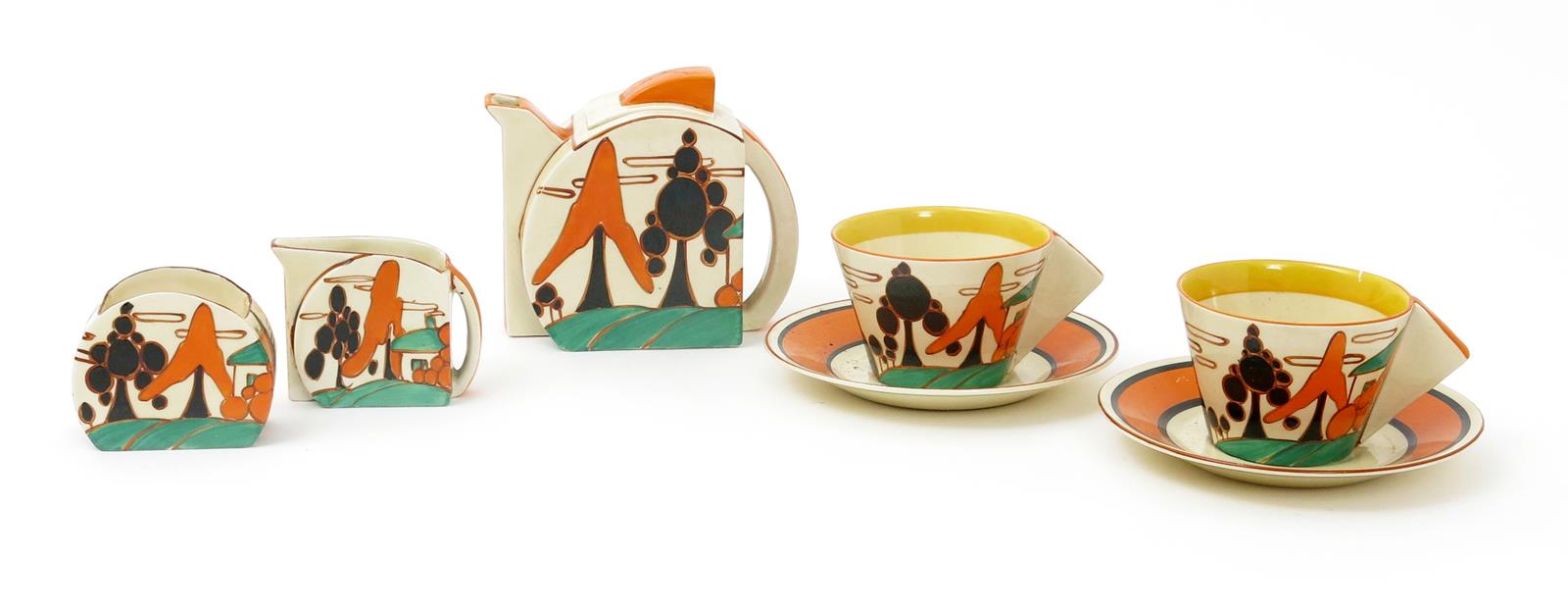 'Orange Trees and House' a Clarice Cliff Fantasque Bizarre Stamford tea for two, painted in colours comprising; teapot and cover, milk-jug and sugar basin, two cups and saucers printed factory marks, cover repaired, one cup cracked, 12.5cm. high (teapot), (7)