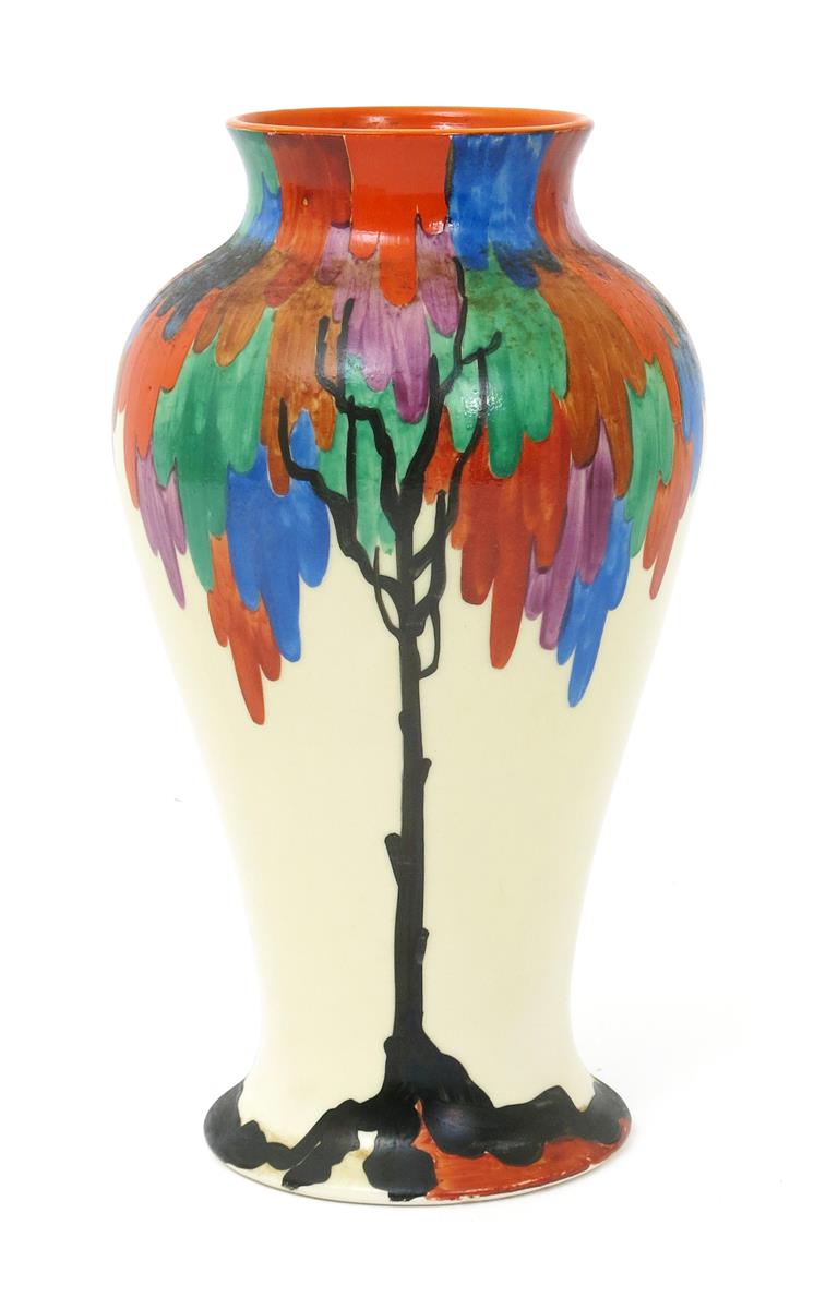 'Latona Tree' a tall Clarice Cliff Bizarre Mei Ping vase, painted in colours on a Latona ground, printed and painted marks, 30.5cm. high