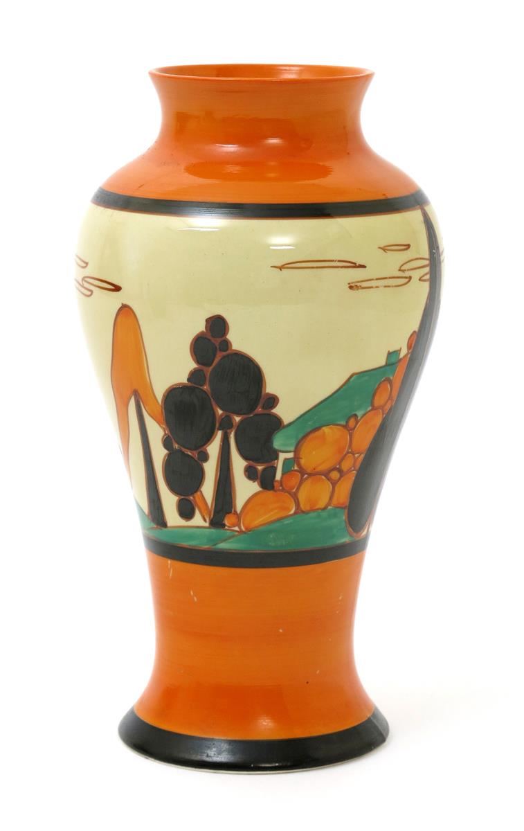 'Orange Trees and House' a Clarice Cliff Fantasque Bizarre Mei Ping vase, painted in colours between orange and black bands, printed factory mark, 22.5cm. high
