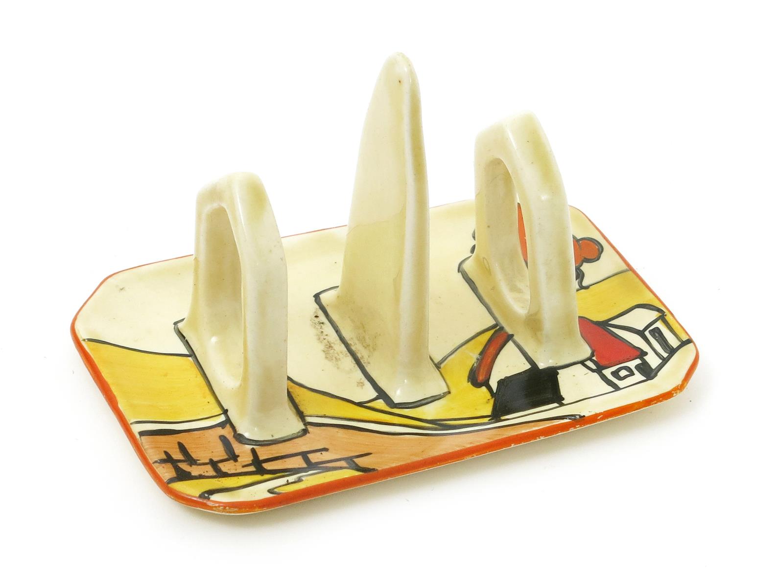 'House and Bridge' a Clarice Cliff Bizarre toast-rack, painted in colours, printed factory marks,12.5cm. wide.