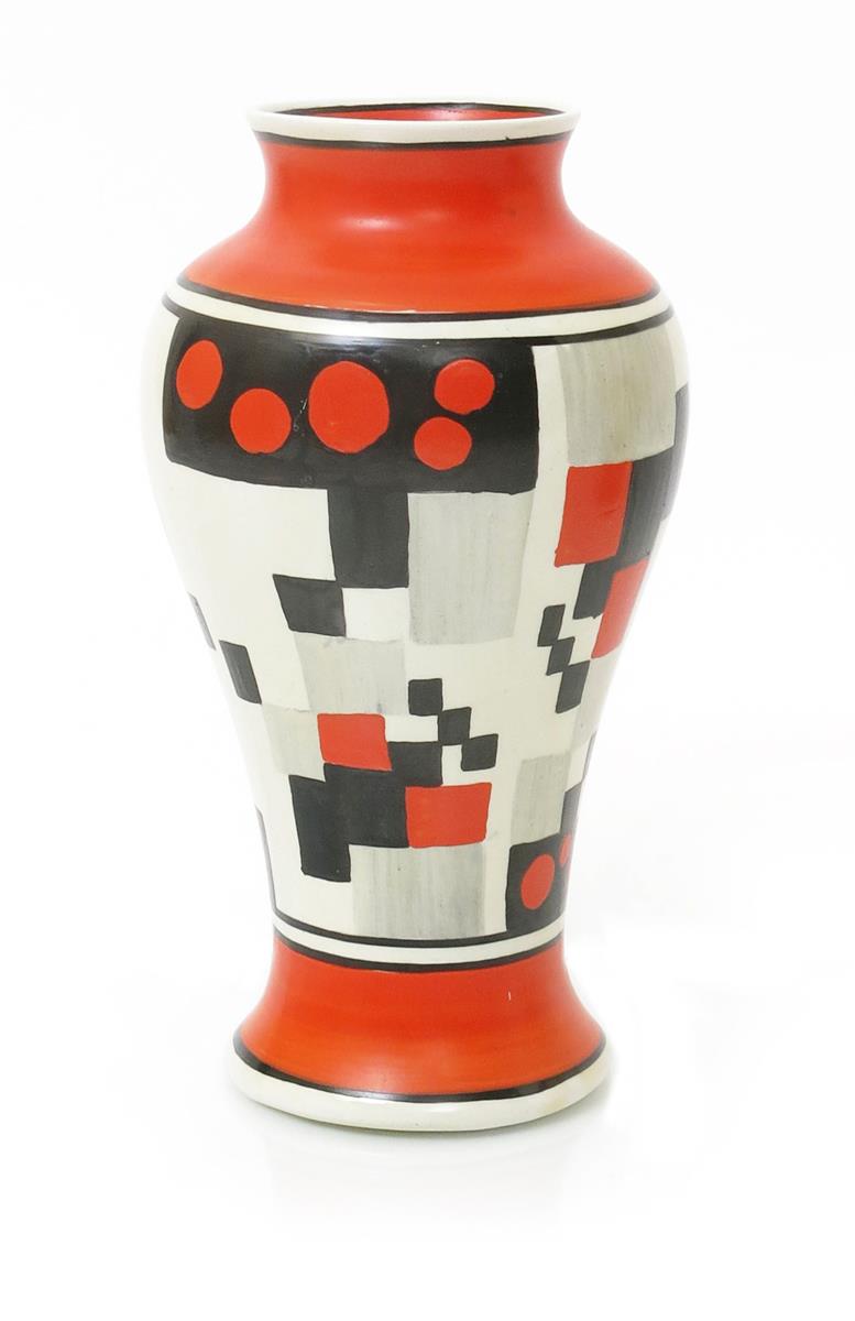 'Red Cafe' a rare Clarice Cliff Bizarre Mei Ping vase, painted in red, grey and black between coral red bands printed factory marks, Sevi Guatelli paper label, 22.5cm. high