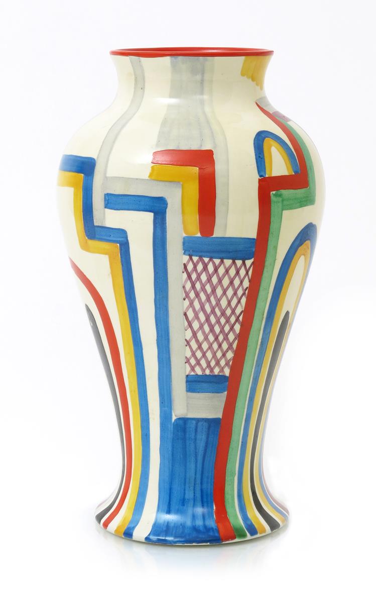 'Tennis' a tall Clarice Cliff Bizarre Mei Ping vase, painted in colours, the top rim with coral red band to interior, printed factory mark, minor professional restoration to the base rim, 31cm. high