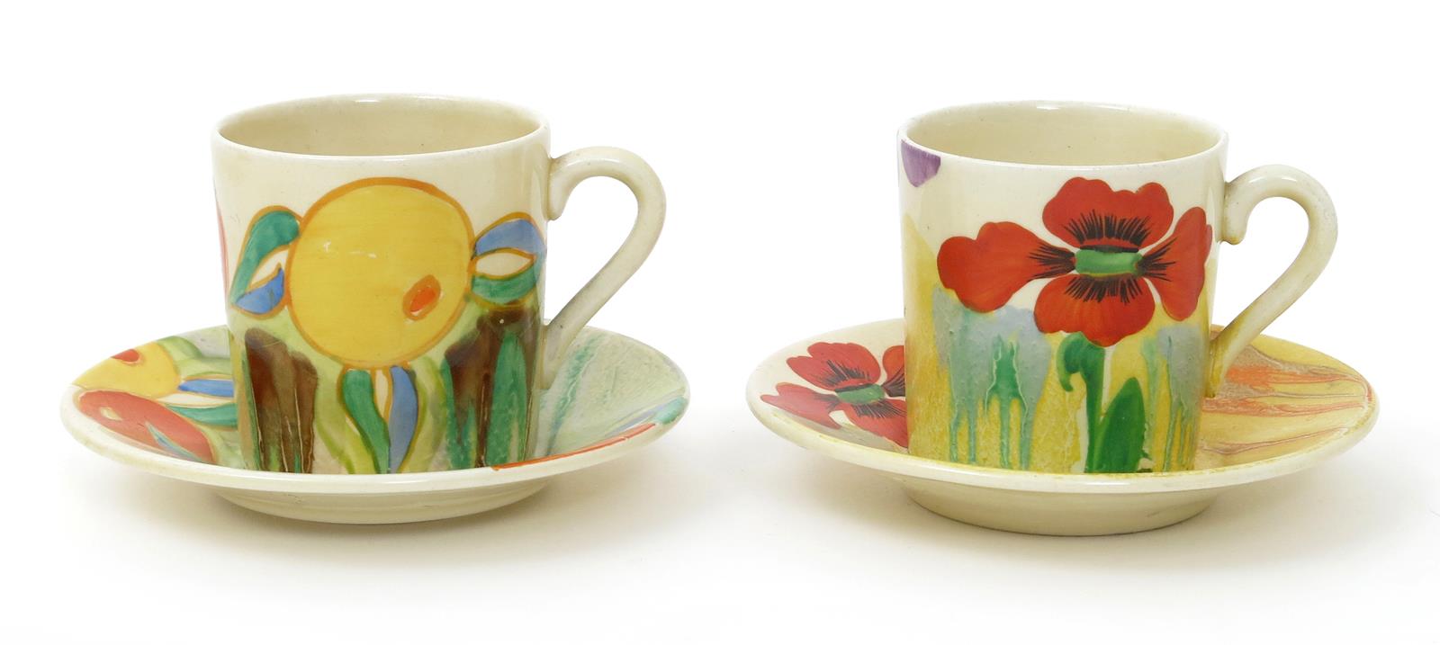 'Delecia Poppy' a Clarice Cliff Bizarre Tankard coffee can and saucer, painted in colours, and a 'Delecia Citrus' Tankard coffee can and saucer printed factory marks, 7cm. high, (4)