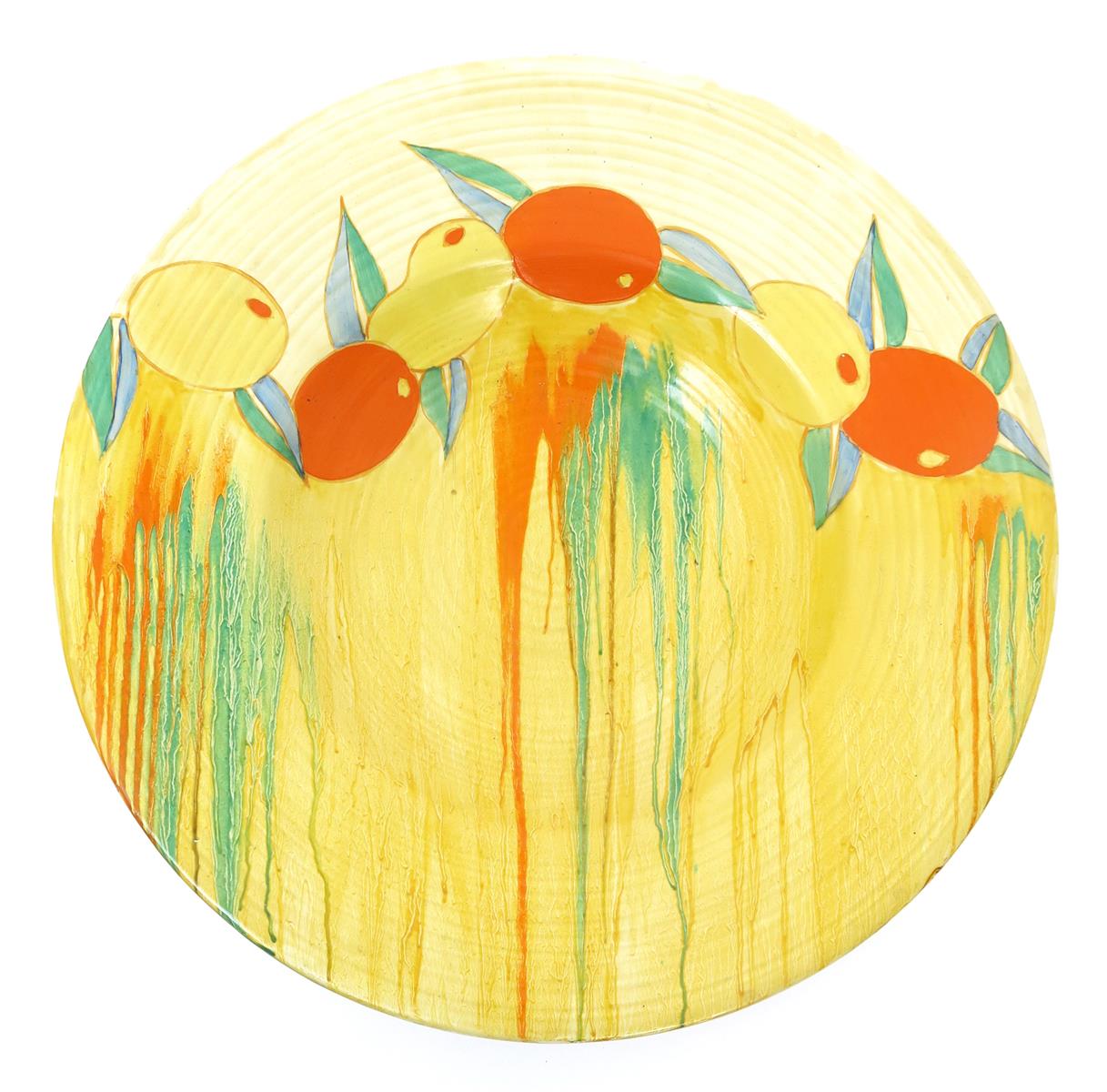 'Delecia Citrus' a Clarice Cliff Bizarre ribbed wall charger, painted in colours printed factory marks, professional restoration to mount holes on foot rim, 45.5cm. diam.