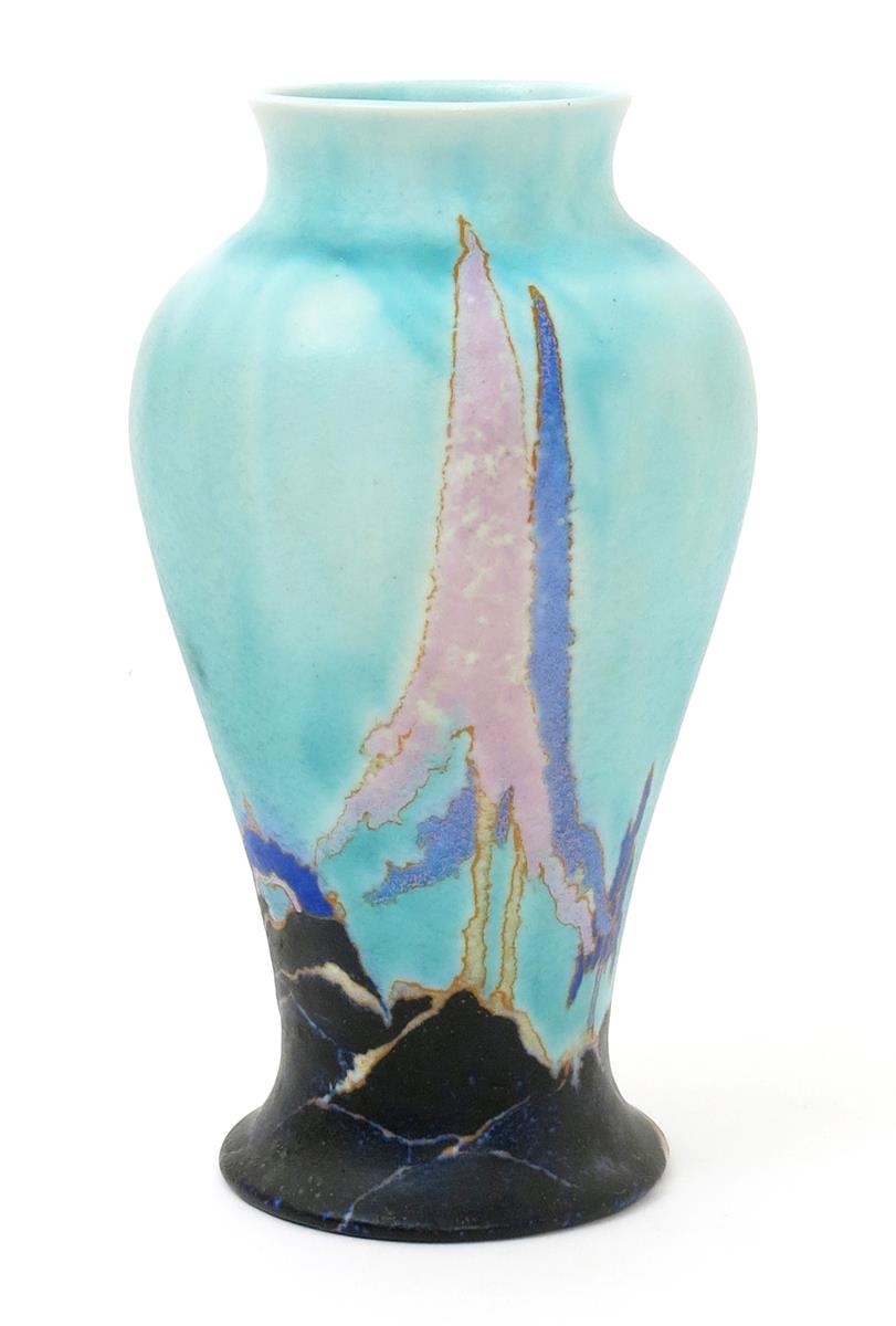 'Inspiration Caprice' a Clarice Cliff Bizarre Mei Ping vase, painted in shades of blue, pink and buff on a turquoise ground, printed and painted marks, 31cm. high