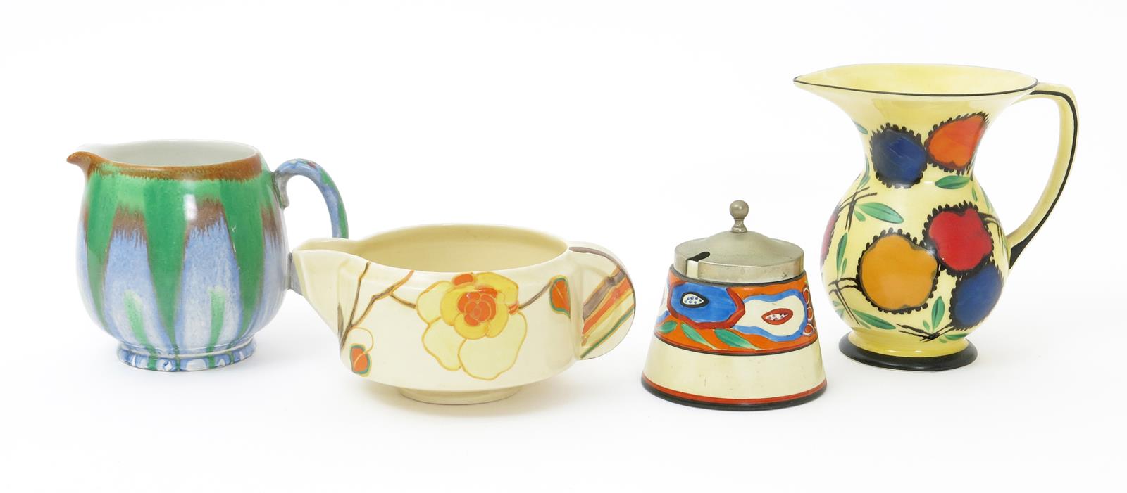 A Clarice Cliff Bizarre preserve pot, with electroplated cover, painted in stylised flowers and foliage in colours, a 'Yellow Rose' Clarice Cliff Odilon sauce boat, a Shelley Harmony jug and an Art Deco jug, printed factory marks, 9.5cm. high (preserve pot), (4)