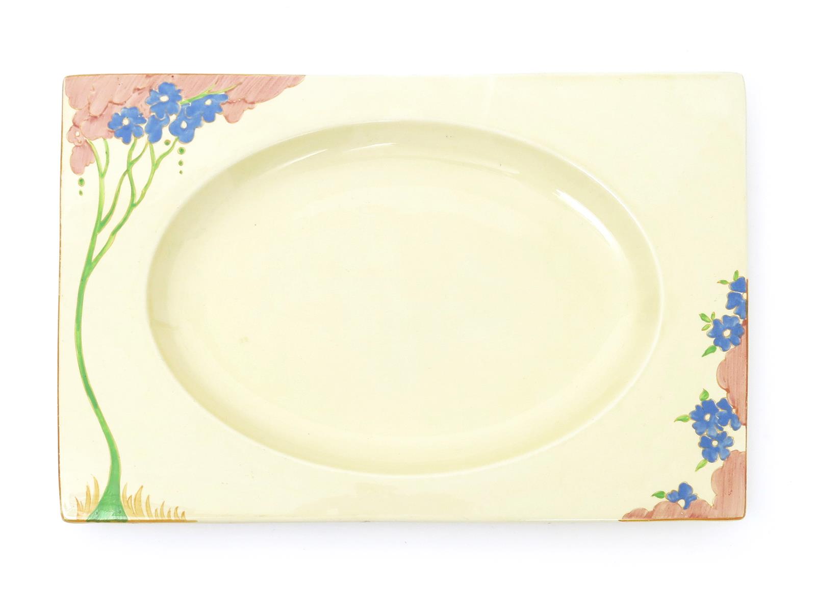 A large Clarice Cliff Bizarre Biarritz serving platter, painted with a stylised slender tree and flowers to the shoulder, in shades of pink, blue and green outlined in yellow, printed factory mark, 45cm. wide.