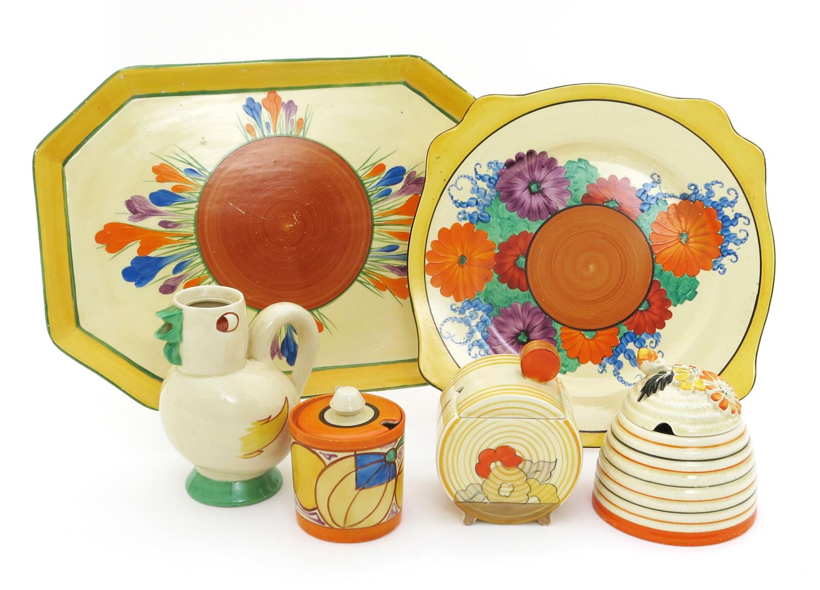 'Melon' a Clarice Cliff Fantasque Bizarre Cylindrical preserve pot and cover, painted in colours between orange bands, a 'Marguerite' Beehive Honeypot and cover, a 'Capri' Bon jour preserve pot and cover, a Crocus octagonal tray and two other Clarice Cliff items, printed and painted marks, 8.5cm. high (preserve pot), (6)