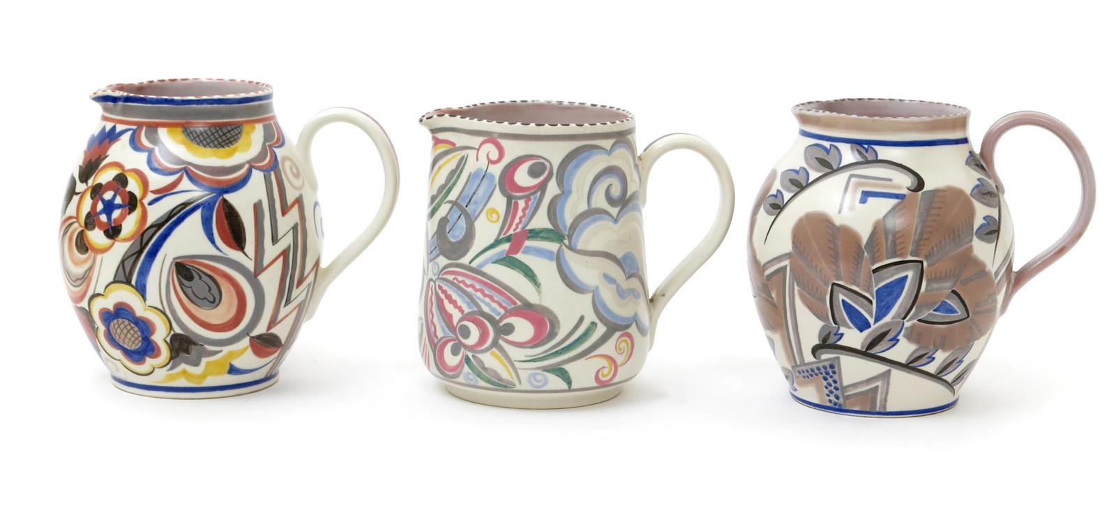 An Art Deco Poole Pottery jug designed by Truda Carter, painted by Doris Marshall, pattern no.LW, painted with geometric foliage in mushroom, blue, grey and black on a white ground, and two other Art Deco Poole Pottery jugs painted with flowers and foliage impressed and painted marks, 18.5cm. high (3)