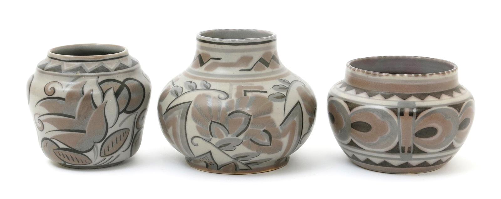 A Poole Pottery vase designed by Truda Carter, painted by Eileen Prangnell, pattern PJ, compressed form with collar neck, painted with geometric flowers and foliage in shades of mushroom, grey and black, and two others similar impressed and painted marks, 14.5cm. high (3)