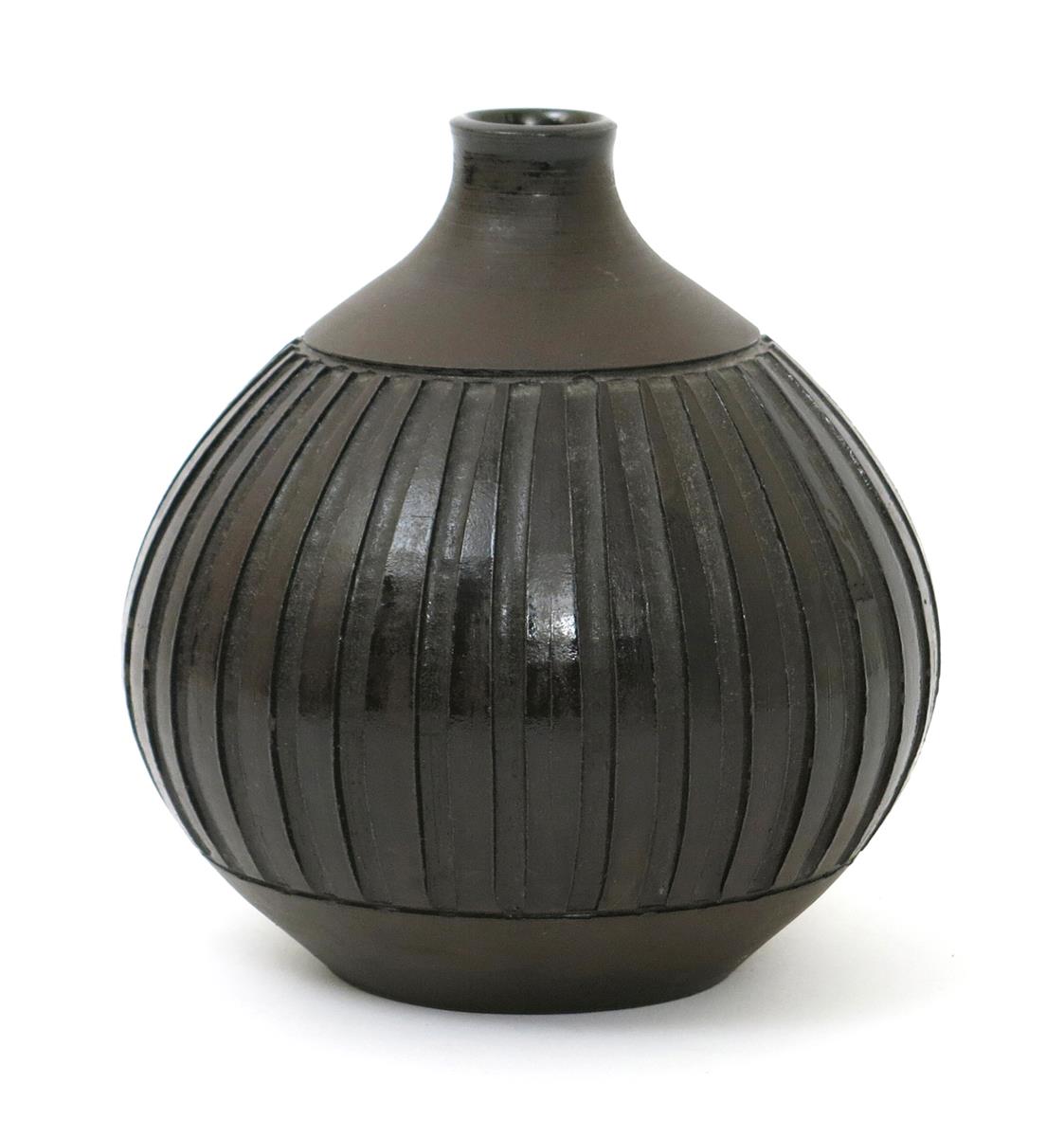A Poole Pottery Atlantis vase by Guy Sydenham, ovoid, with narrow neck, incised with deep vertical grooves, glazed dark brown, impressed mark and incised GS monogram, 19cm. high