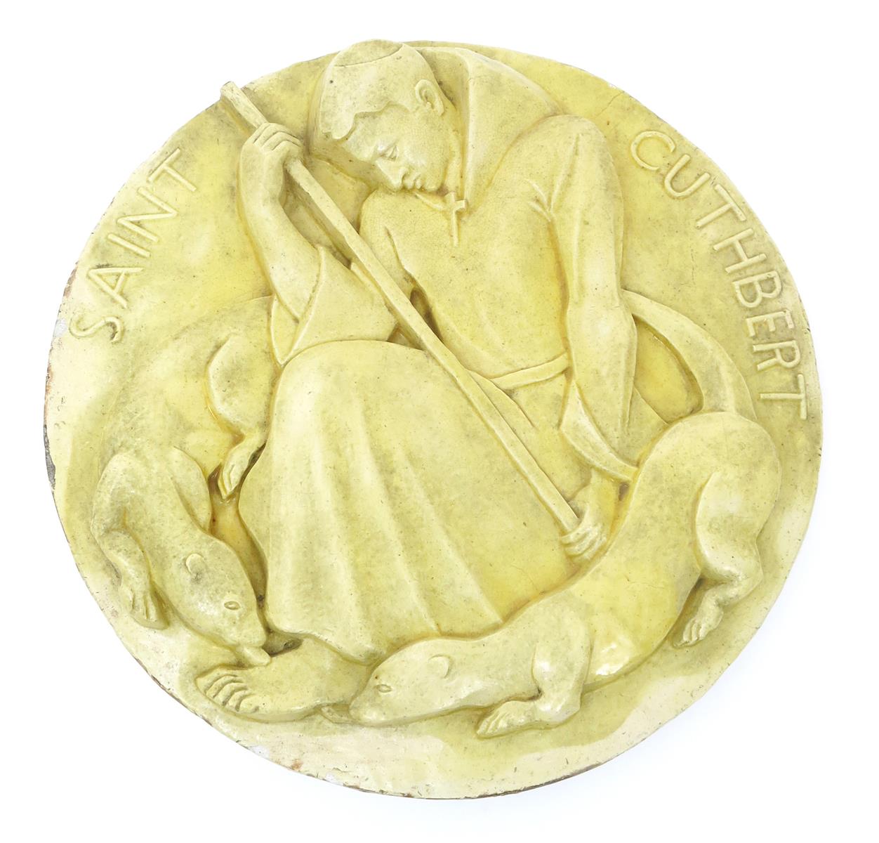 St Cuthbert a stoneware wall plaque, dated 1934, circular cast in low relief with the saint and two otters, glazed yellow, impressed A Blackman and dated 1934, chips, 45cm, diam.