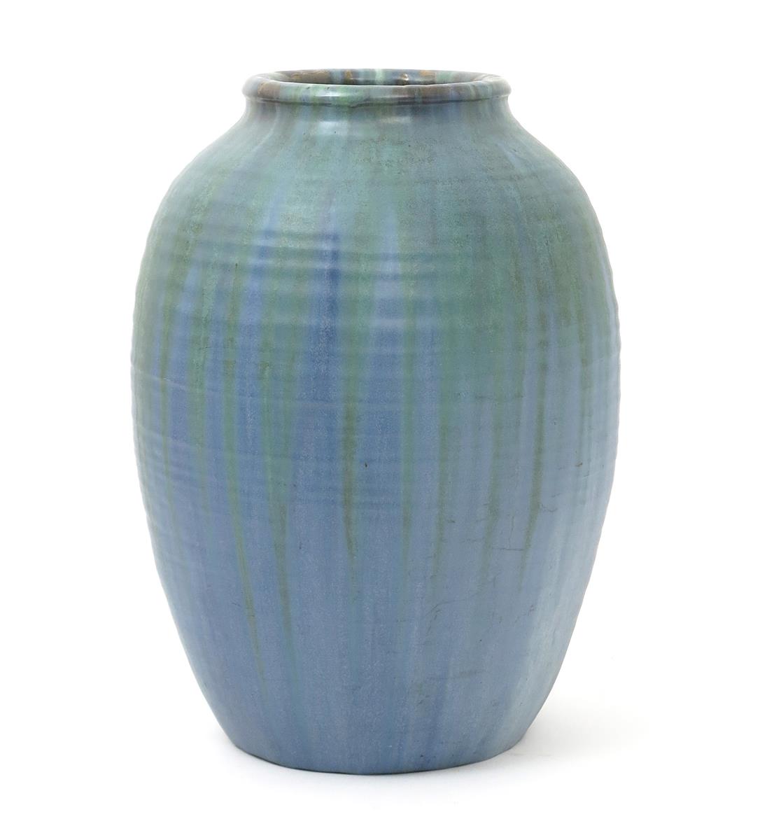 A massive Upchurch Pottery vase, shouldered cylindrical form, covered in a streaked green and blue matt glaze, impressed marks, painted 4C, 38cm. high