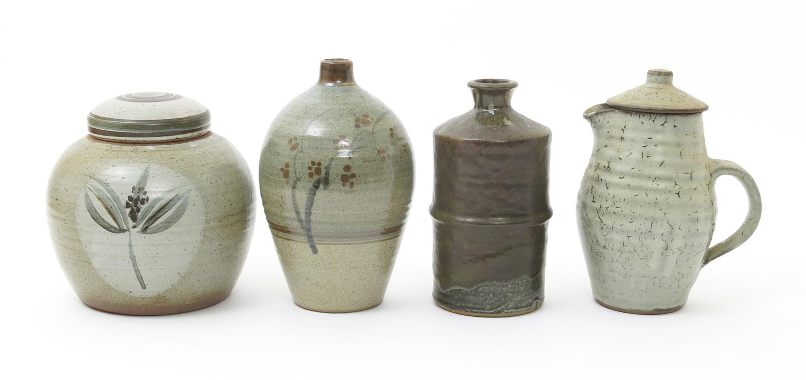 a Lowerdown Pottery stoneware vase, shouldered form with a solifleur neck, painted with prunus stem decoration in iron red and blue on a mottled oatmeal glaze, a David Leach vase, a Ray Finch ginger jar and cover and ten other studio pottery items various impressed seal marks, 23cm. high (Lowerdown vase), (13)