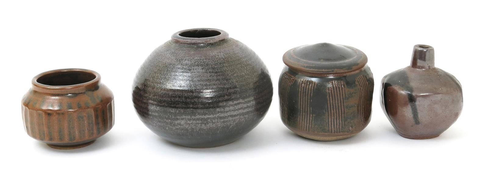 a St Ives pottery vase, square section with solifleur neck, covered in tenmoku glaze with dark splashed glaze to the shoulder, a David Leach stoneware vase and two other vases, impressed seal marks, 10.5cm. high (4)