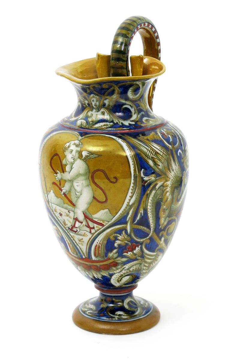 A Cantagalli Hispano-Moresque pottery ewer, footed form with scroll handle with mask base, painted with a cherub in heart-shaped panel, inside classical dragons, in gold and red lustre on a blue ground, painted mark to base, 29cm. high