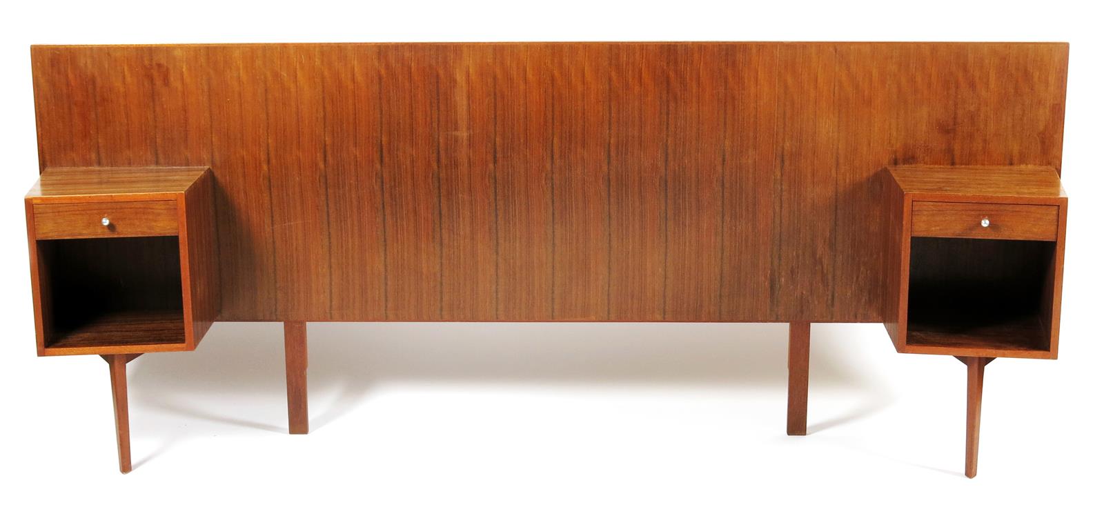 A Gordon Russell Workshops three piece bedroom suite, 1961, comprising double headboard with built in bedside cabinets, dressing table and mirror, and three drawer chest of drawers, with chrome metal furniture, applied labels, (3)