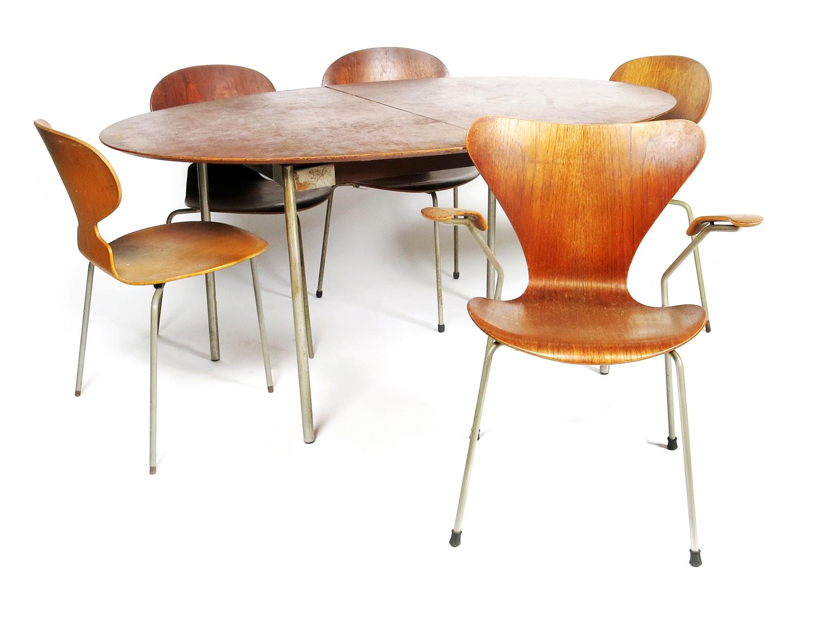 A Stag Furniture extending dining table designed by John & Sylvia Reid, model S210, teak with satin finish, oval on aluminium legs, seven Fritz Hansen Ant chairs, model no. 3100 designed by Arne Jacobsen and two Series 7 armchairs designed by Arne Jacobsen, some factory marks, table 151cm. long, 70cm. high, 100cm wide. (10)