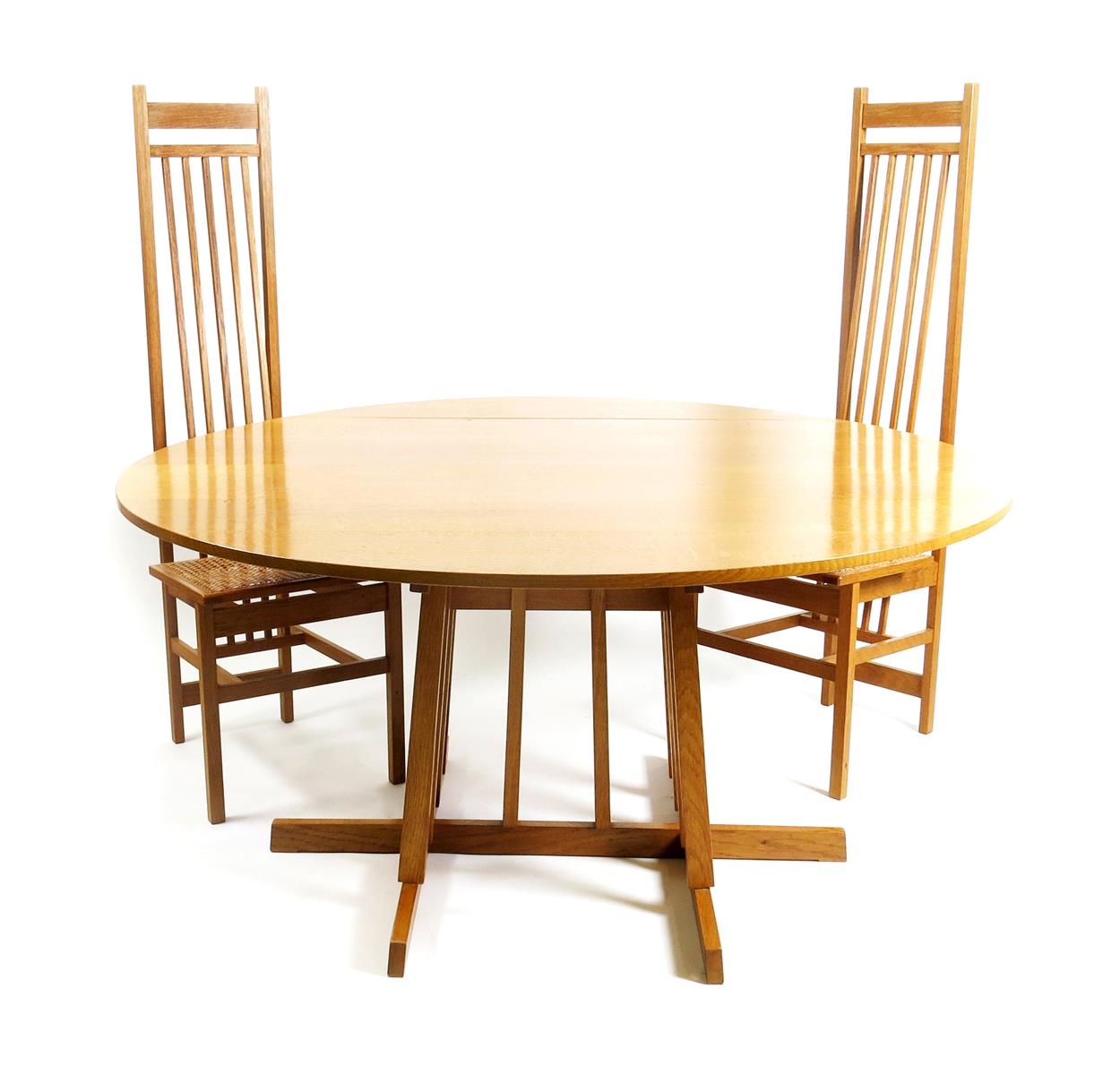 an English oak dining table and eight chairs, the chairs commissioned in 1977, the table commissioned in 1985, the table with circular top on sleigh foot with square section cluster legs, the high-back chairs of slender slat construction with cane seats, signed and dated, table 142cm. diam, 71cm. high, chairs 135cm. high, (9)