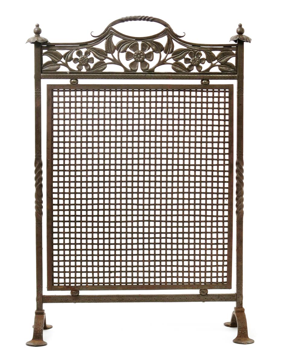 A Cotswold School wrought iron firescreen probably Thornton & Downer, the rectangular frame cast twist and geometric decoration, below pierced and cast foliate frieze, with central woven screen panel, unsigned 81cm. high