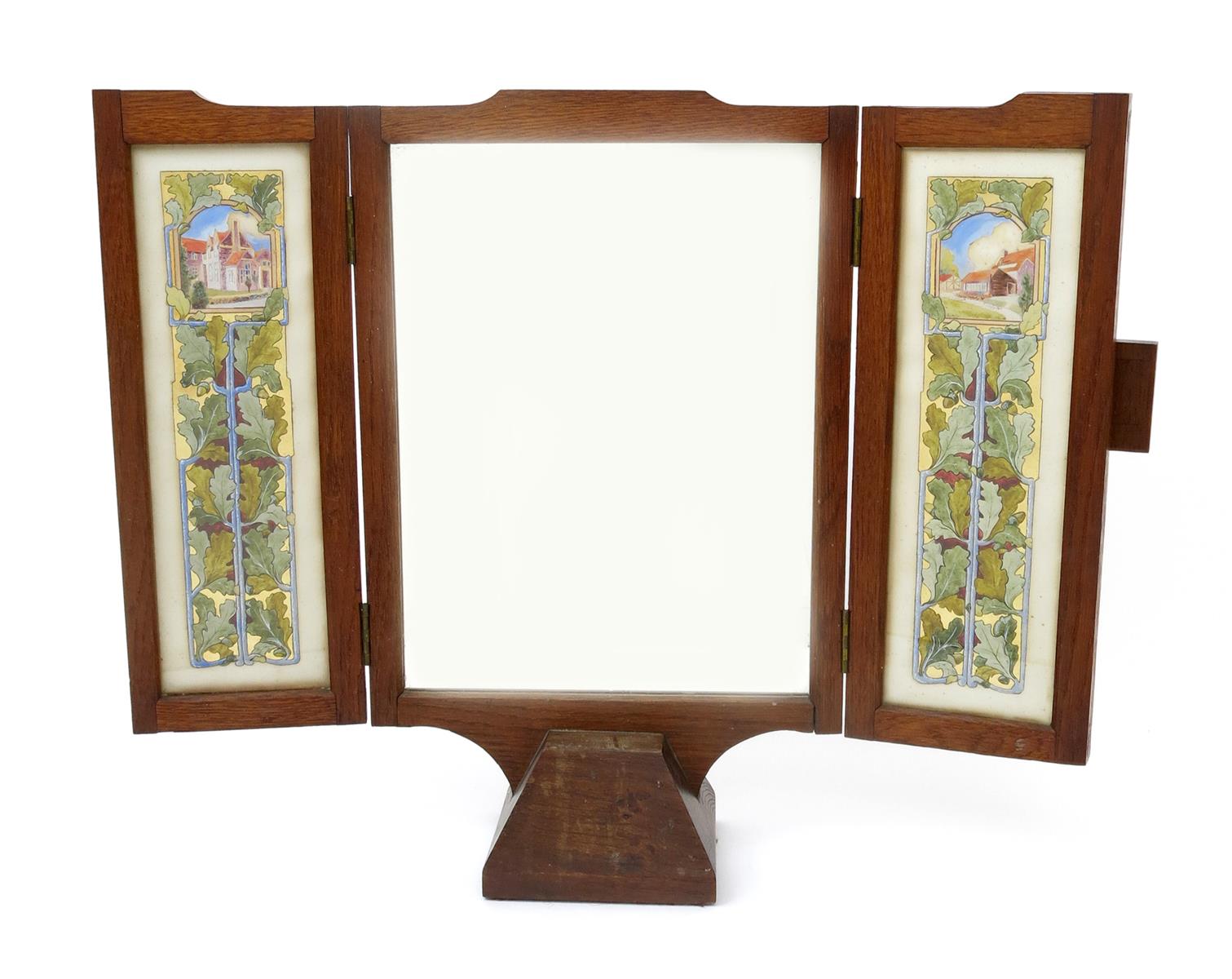 An Arts and Crafts oak triptych, central mirrored panel flanked with Cotswold school painted panels depicting house vignettes inside oak leaf border, with enamelled shield unsigned 53cm. high
