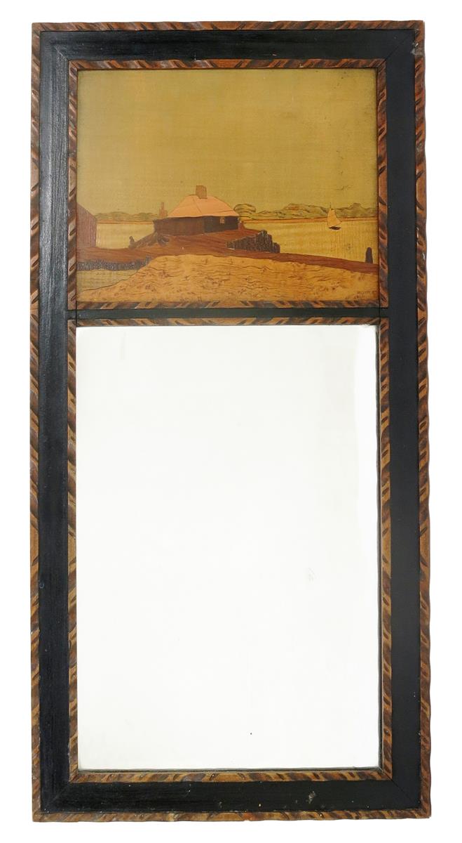 Heybridge a Rowley Gallery marquetry mirror, rectangular form, with rectangular marquetry panel of a cottage overlooking an estuary landscape with sailing vessels, impressed marks to panel, applied Rowley label to reverse with title, 63 x 32cm.