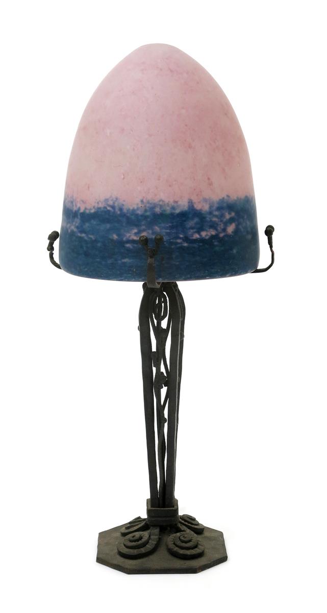 A patinated metal table lamp with glass shade, the glass domed shade graduating from pink to blue shade with acid etched signature, 44cm. high, (2)